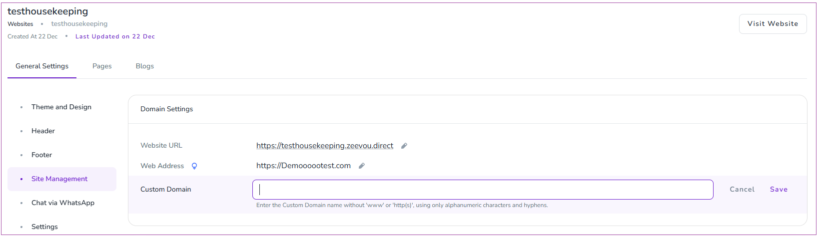 A Custom Domain is a special address you can choose for your website, making its name easy to remember. Follow the steps below to set up a Custom Domain: