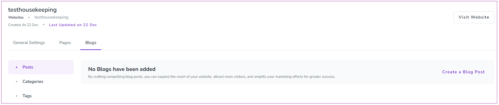 To add a blog post, go to Websites -> Blogstab and click on Create a Blog Post.