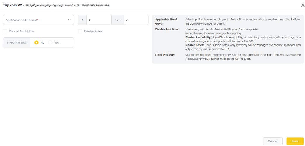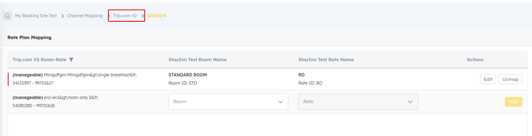 Upon the mapping screen, you can see the list of Trip.com V2 Room Type/Rate Plan along with channel manager Room Type/Rate Plan.