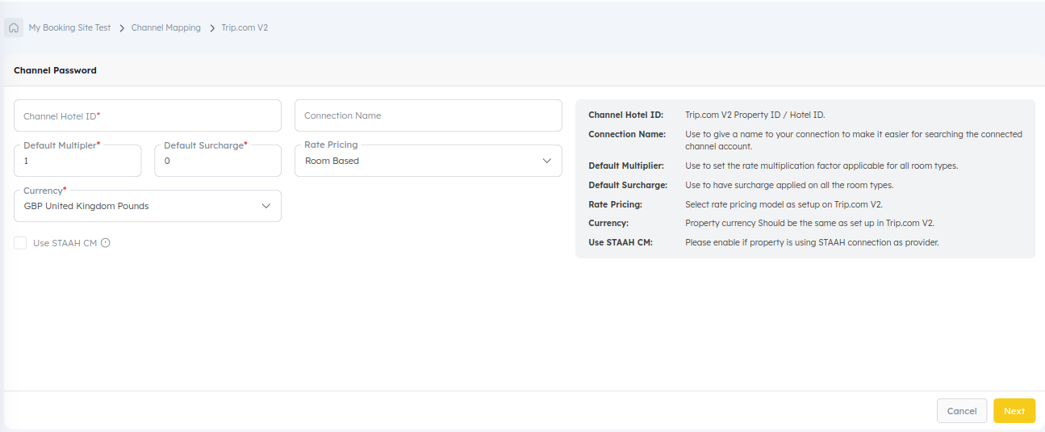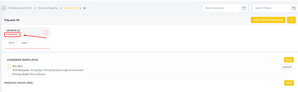 New Trip.com V2 listing: If room is not linked to a Trip.com V2, mapping details will not be displayed. If you want to connect multiple Trip.com V2 channels ID under on property Click on ‘Link To New Location ID’ > proceed as per normal OR under channel connection module. Click on Trip.com V2. Click on Add Channel Password. Add new Trip.com V2 ID details and proceed for the mapping.