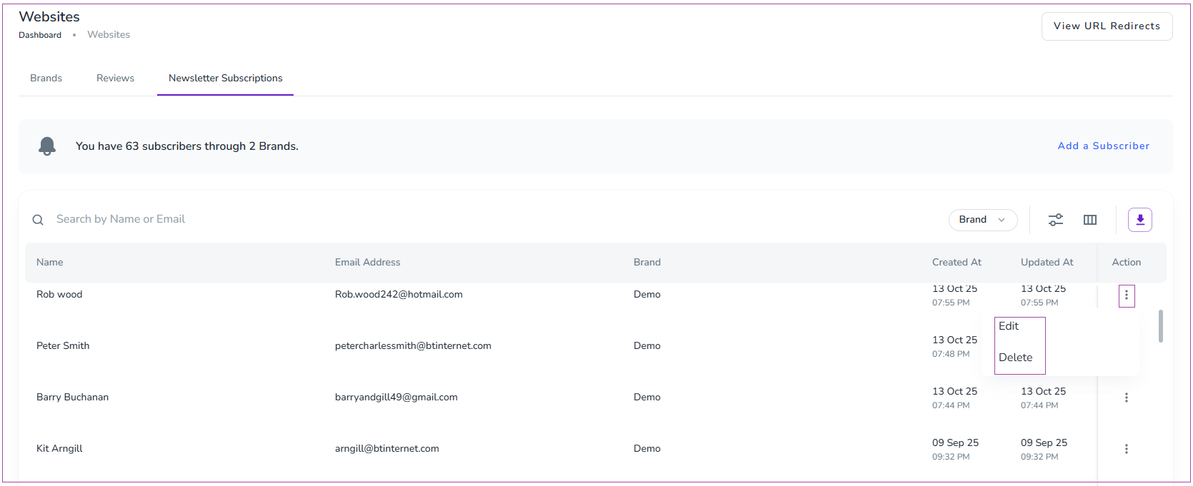 Then, you can view Newsletter subscribers on the Websites dashboard, under the Newsletter Subscriptions tab. You can click on three dots to Edit oe Delete each of them.