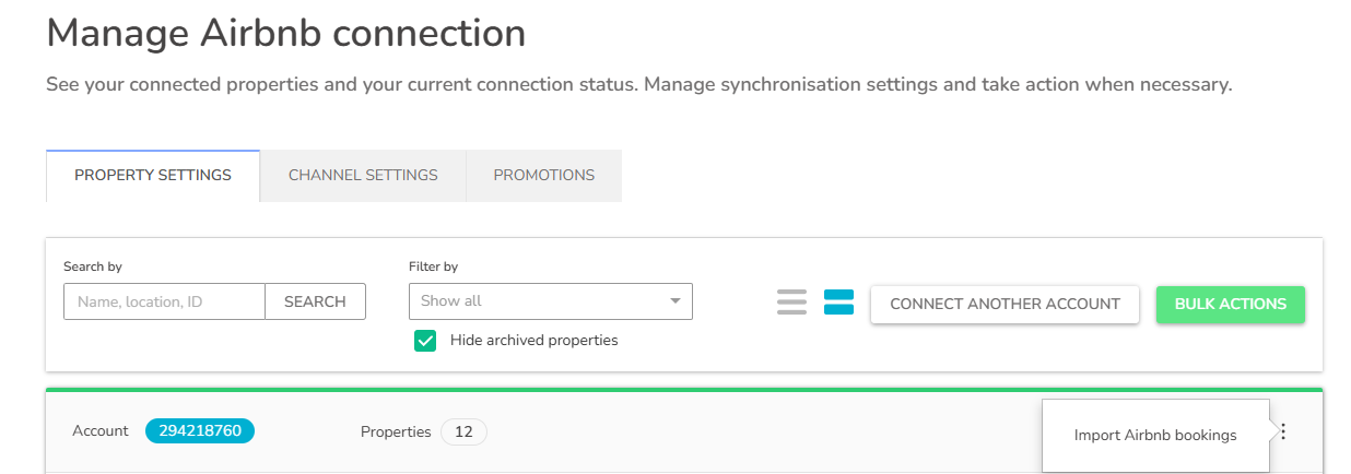 Once synced, you must import existing bookings by clicking the three dots on the right next to the arrow, and choose Import Airbnb Bookings.