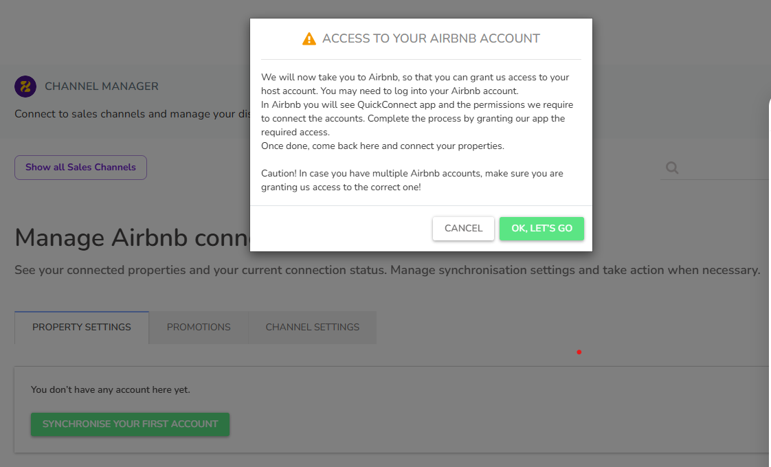 Log in to Airbnb.com Extranet and click the Access button to confirm the connection request. Make sure you are logged in to the correct Airbnb account before grantin access.