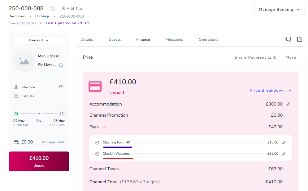 Fees/Upsells Expense: Created for the purchase price of the “Check-in Welcome” fee, which did not have a specific expense type defined — so the system used the default Fees/Upsells Expense category.
