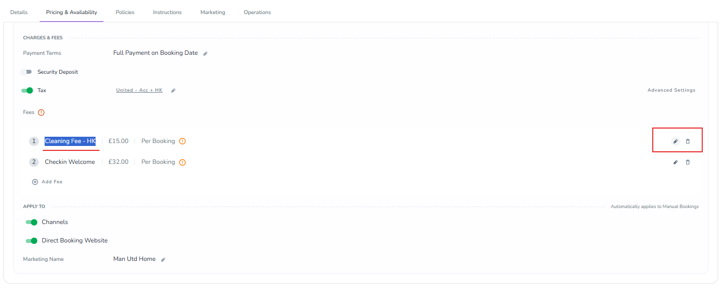 For example, you can view or edit the related expense type of each Fee in the Listing Dashboard under the Pricing & Availability tab by clicking the pencil icon: