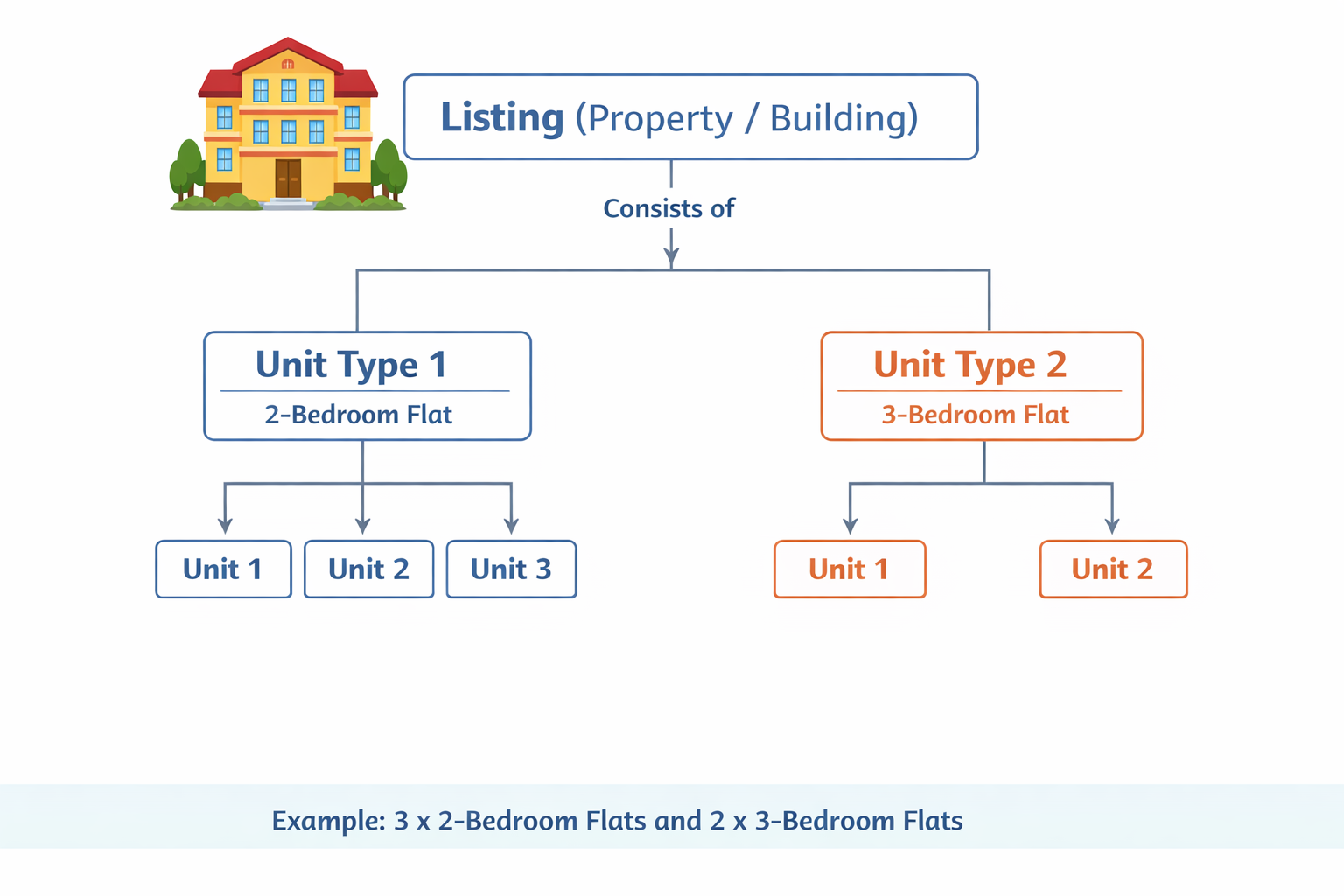 Listing / Property | single bookable space. | Listing (can contain multiple room types) | Listing (can contain multiple unit types) |