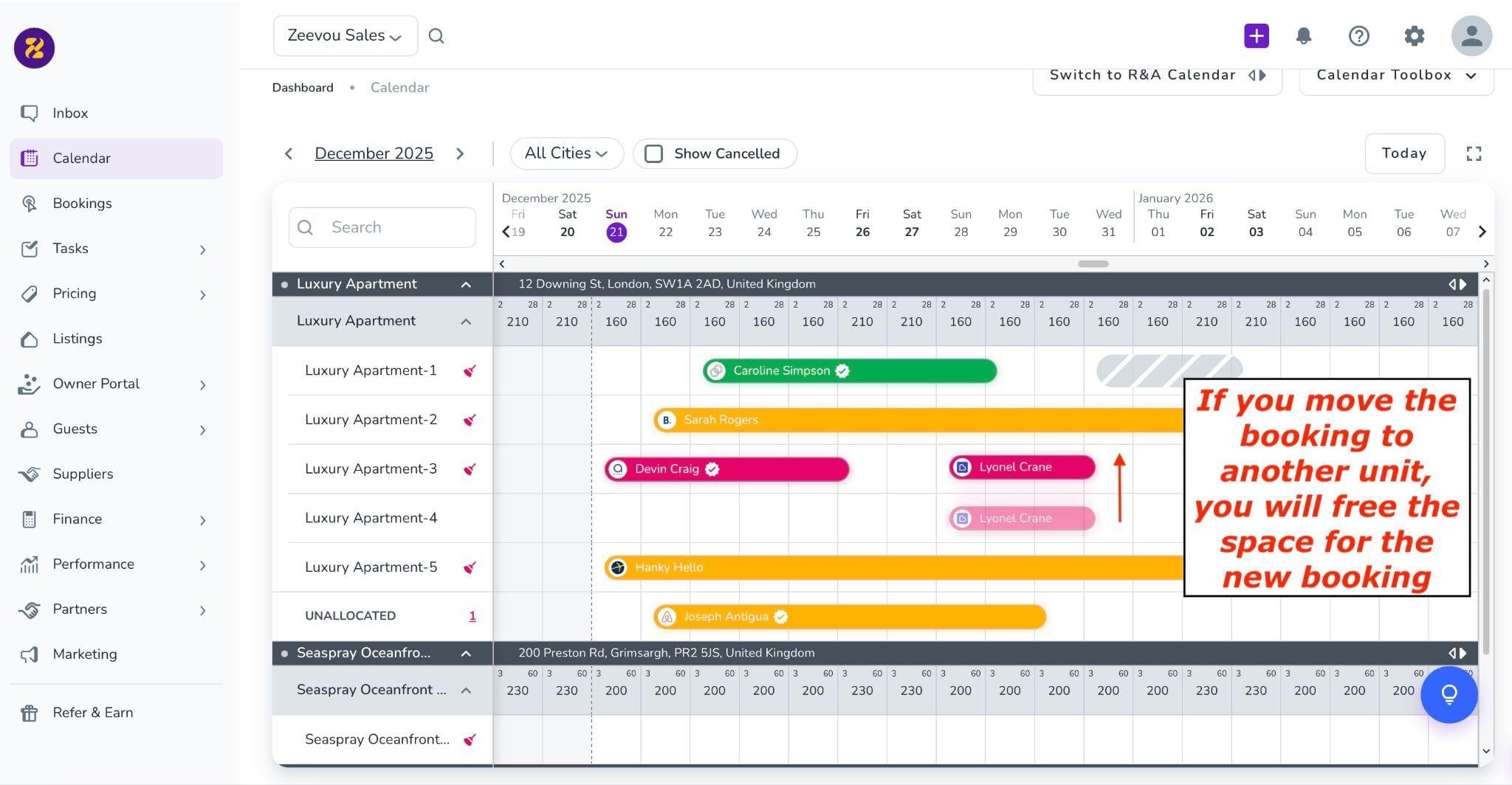 For example, in the following images, you can see an unallocated booking from December 22nd to 29th. At first glance, you might think there is no availability, but with a slight change in the bookings, you can easily find a place for that booking.