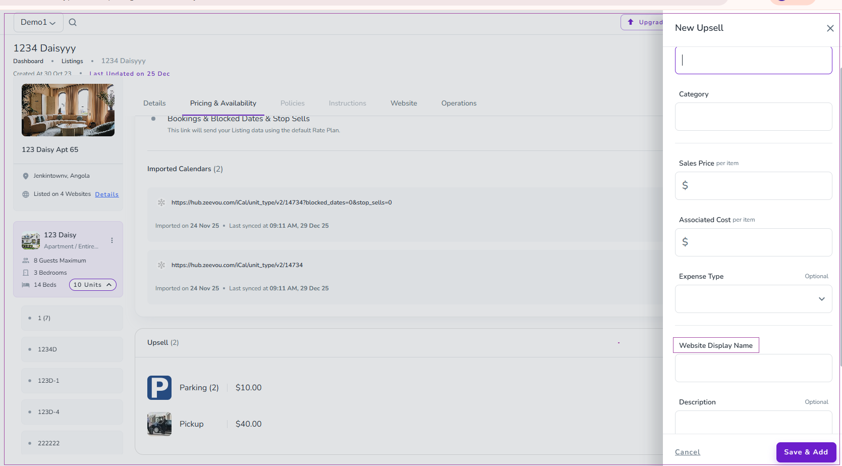 When you click on +Create a New Upsell, a drawer opens in which you can insert Label, Category, Sales Price per Item, Associated Cost per Item, and Website Display Name. Finally, click on Create & Add.