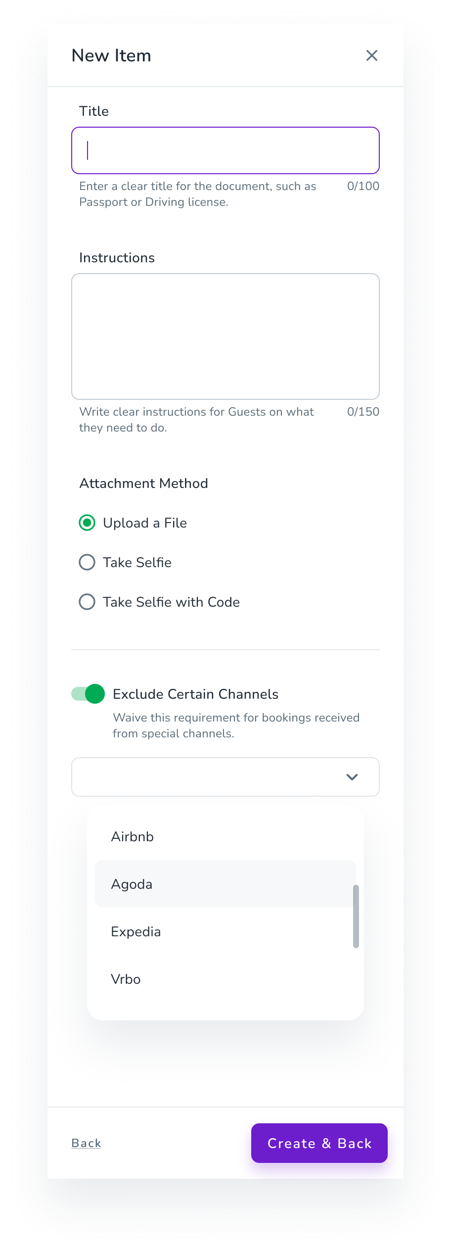 2- When you click on Add Item, a drawer opens in which you can insert the Title, its Instruction, and its Attachment Method. You may turn on the toggle of” Exclude Certain Channels” to choose which booking channels should request and receive ID uploads by selecting the relevant channels from a dropdown. Finally, click on Create & Back.