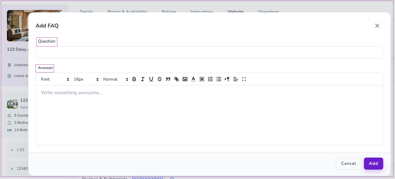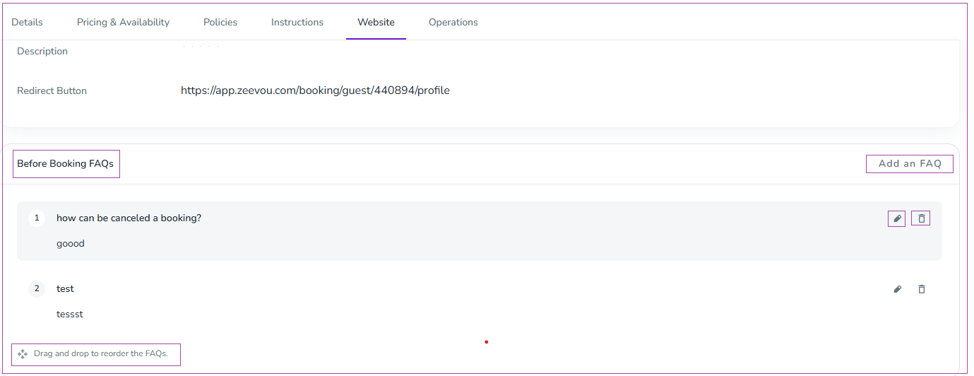 In order to add FAQs on your website homepage, go to Listings-> Website tab-> Before Booking FAQs card. You can view and edit the existing FAQs or click on Add an FAQ to create a new one.